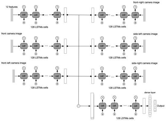 The architecture of such an advanced model is similar to the previous basic model. An “encoder–decoder” structure is maintained to learn the information hidden in the input features. The difference is that the front camera images are treated as additional inputs. The detail of this architecture is shown as Figure 5.
