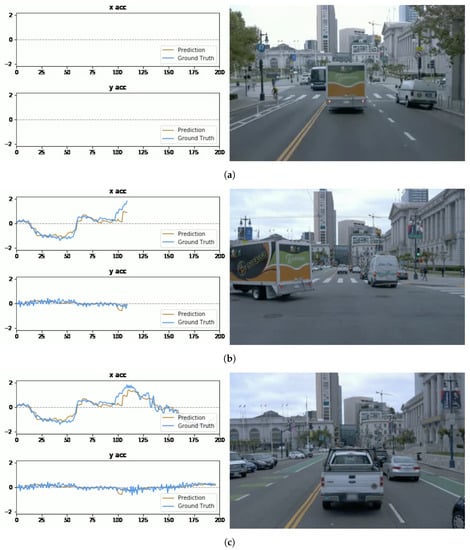 Key frames representing three different scenarios, all are extracted from segment-10289507859301986274 from tar validation_0001. (a) In the first frame of the video, this is a typical “car-following” scenario: the AV follows the truck steadily, and the initial value of the acceleration is around zero; (b) In the 108th frame of the video, the truck turns left and, at this moment, there is no detected front car and the AV accelerates. The ground-truth and the prediction acceleration curves climb simultaneously; (c) In the last frame of the video, the declining acceleration curves show that the AV brakes accordingly as the front car stops due to the traffic ahead.