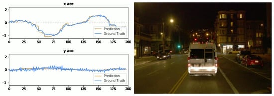 When it comes to lighting conditions, there are other complicated scenarios such as nighttime, rainy days, and so on. Figure 8 shows an example of driving during nighttime; the overall trend of the prediction curve varies similarly to the ground-truth curve, which helps to hold the prediction loss at a low level. This proves our model’s capability of handling more complex sight conditions in different scenarios. In conclusions, our model behaves very similarly to Waymo’s self-driving policies, in spite of a little more conservativesness in acceleration and deceleration prediction than Waymo’s model.