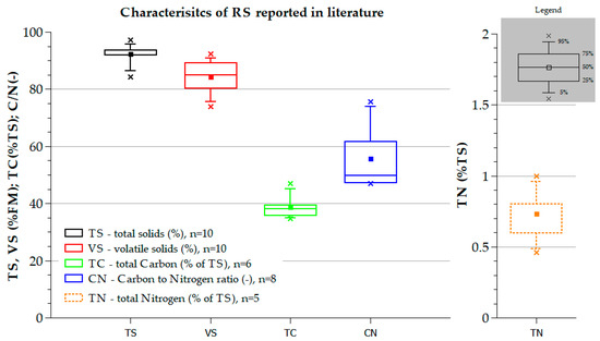 The general characteristics of RS such as total solids (TS), volatile solids (VS), total carbon (TC), total nitrogen (TN), and C/N ratio are usually reported as a single value or mean values with a variation in the literature. The original data is further processed to generate median, maximum, minimum, and quartiles as shown in Figure 2. Box plots of TS and VS are smaller, and the whiskers do not extend as far, indicating that these properties do not differ much over the various analyzed studies, while the C/N ratio is different for the RS used in these studies with spread-out data points [10,26,28,36,37,38,39,40,41,42].
