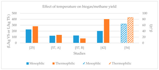 The studies mentioned above investigated the effect of mesophilic and thermophilic conditions on the biogas/methane yield. The biogas/methane yields at both temperatures in these studies [25,42,54,57] are shown in Figure 4. About 13–100% more methane is yielded at thermophilic as compared to mesophilic conditions in the four experiments, while in one AD test, 62% more methane was produced at mesophilic conditions.