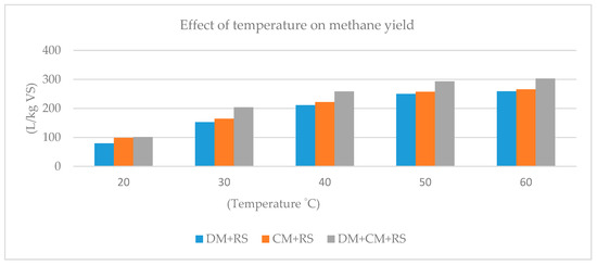 The effect of increasing temperature on the CH4 yield from co-digestion of dairy manure (DM), chicken manure (CM), and RS has been investigated [26], and the results are shown in Figure 5. RS was co-digested with DM, CM, and also in a mixture with both manures in batch digesters at 20, 30, 40, 50, and 60 °C. CH4 yield continuously increased by increasing the temperature. CH4 yield in three mixtures was on average 2.5 times higher at 40 than at 20 °C, while only about 1.2 times higher at 60 than at 40 °C. No significant difference was observed in CH4 yields between 50 and 60 °C [26].