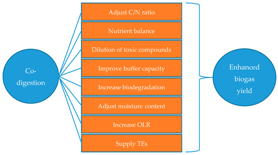 The term co-digestion describes the simultaneous digestion of a mixture of two or more substrates. Co-digestion offers various advantages like improved system stability, adjusted C/N ratio, a better nutrient balance, dilution of toxic compounds, improved buffer capacity, increased biodegradation, adjusted moisture content, a supply of TEs, and increasing OLR. It can therefore, enhance volumetric biogas recovery [61,62,63] and improves the fertilizer value of the digestate [64]. These advantages of co-digestion are presented in Figure 6. Co-digestion of RS with different animal manures is considered a more cost-effective method for nutrition regulation than the addition of N-containing chemical reagents like ammonium bicarbonate or urea [40].