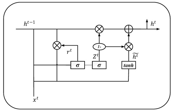As Figure 3 shows, there is a current input , and the hidden state is passed by the previous node; this hidden state contains information about the previous node. Combined with and , GRU will obtain the output , which is a hidden state passed to the next node. The process can be formalized as follows: