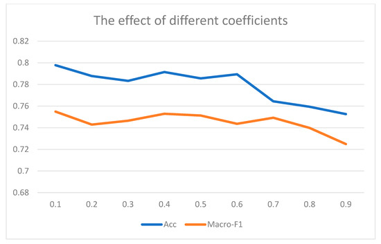 The essence of CTI was the information interactive fusion component. The information we obtained from the previous layer and the information from this layer need to be weighted in the interactive fusion process. This was the origin of the coefficient . We conducted related experiments on the laptop reviews dataset to find the optimal coefficient . We only changed the coefficient and kept the other parameters unchanged to conduct the experiment. We recorded changes in Acc and Macro-F1 in Figure 4.