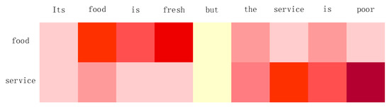 As shown in Figure 7, the sentence “Its food is fresh, but the service is poor” contains two aspects “food” and “service”, but the weight of the context word is different for each aspect word. It could be clearly observed that MIN placed great emphasis on the words that needed attention as we expected. For example, in terms of the aspect “food”, “fresh” received the highest attention, “poor” got a lower level of attention. It effectively avoided the influence of other sentiment words on itself and paid attention to the sentiment words related to itself. This was the result of our model MIN using multiple attention mechanism and dynamic combined context information.