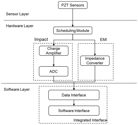 A significant problem of an integrated PZT-based SHM system is that the different functions need different sampling circuits. Impact monitoring requires several PZT sensors to be sampled simultaneously to locate the place the impact occurs and to evaluate its amplitude. Conversely, the EMI method tends to use one sensor at a time to avoid disturbance from other sensors. This means that the number of PZT sensors should be different for different functions and that there should be different sampling circuits for different usages. Relays serve as channel selectors, but they are bulky and are often used in strong current environments [22]. Note that the multi-channel SHM system works in weak current. Therefore, with the development of microelectronics technology, the MUX has gradually replaced the relay’s position in SHM systems [25]. Therefore, a so-called “scheduling module” part, which is formed by several MUXs, is utilized to schedule the commands to the PZT sensors and transfer their signals to different preprocessing units according to the needs. This is the core idea of integrating these two functions mentioned in one PCB. Meanwhile, the corresponding software is required for the controlling and data processing.