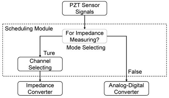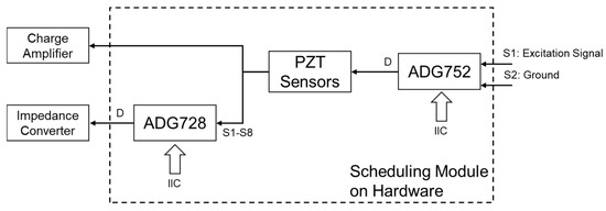 The scheduling module is one of the core components required to achieve the multi-function characteristic of the designed SHM system. As PZT sensors are used as multi-functional sensors, they should be controlled by different circuits for different functions. The basic idea for achieving this is to adopt analog switches. These switches will guide the signal from the PZT sensors to different processing circuit parts according to users’ demands.