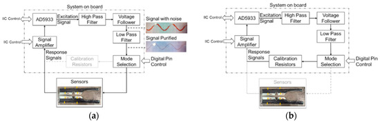 On the other hand, the calibration mode is illustrated in Figure 5b. In this mode, the signal from the voltage follower will be guided to a selected calibration resistor by the mode selection unit. Then, the response signal is measured and its impedance is calculated by AD5933. This signal helps the system take the environment changes into account, improving performance. More detailed information on impedance calculation is illustrated in Section 4.3.