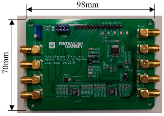 Recently, Islam and Huang [30] achieved damage detection through the combination of the EMI method and GW methods, and Nasrollahi et al. [8] presented an integrated SHM system that includes acoustic emission, EMI, and guided ultrasonic wave. Hyun-Jun Park et al. [31] proposed a wireless hardware scheme for implementing the GW method and measuring EMI signals. The hardware systems involved here are more about the layout of sensors rather than the design of hardware systems and they only utilized disjoint hardware and software parts. Thus, they need to be improved for engineering applications. Nevertheless, limited research has been undertaken to propose a design in which all functions can be integrated into one printed circuit board (PCB).