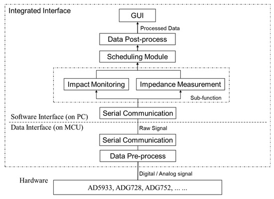 The rest of the paper is organized as follows. The second section provides a general overview of the entire system. The third section provides the integrated PZT-based hardware system schemes. The corresponding software is described in the fourth section, where the integrated interface is proposed. The experiments on impact detection and damage quantification based on the EMI method are discussed in the fifth section. Finally, conclusions are outlined in the last section, which also suggests the possible future work.