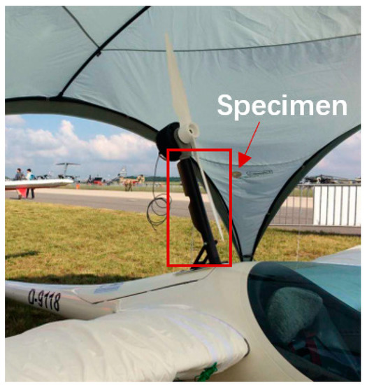 The monitored structure is the main load-bearing structure of a retractable propulsion system for a sailplane, as depicted in Figure 11. It is a cylinder-like structure which is co-cured from two pieces of shell structures. The thickness of the shell structures is ~2 mm. The structure is made from carbon fiber-reinforced plastic and glass fiber-reinforced plastic. Eight encapsulated piezoelectric transducers called PZT layers [33] were adhered to the inner surface of the structure during the manufacturing process, as illustrated in Figure 12. The PIC255 material (Physik Instrumente (PI) GmbH & Co. KG, Karlsruhe, Germany) was selected as the material of the piezoelectric sensor, and some parameters are shown in the Table 3. The diameter of the PZT ceramic is 8 mm and the thickness is 0.12 mm. The test for the proposed SHM system is illustrated in Figure 13. Several experiments, including impact amplitude and location detection test and damage detection using EMI methods, are conducted on this subject.