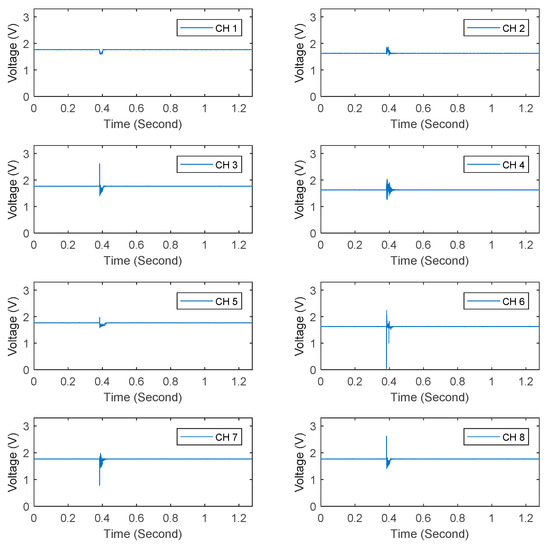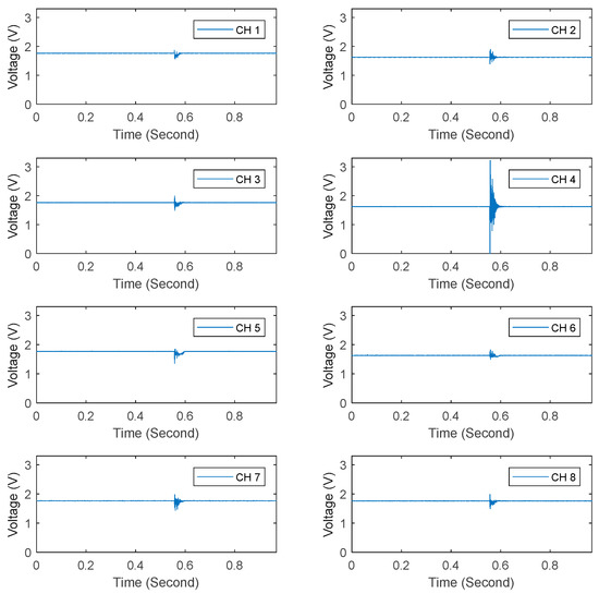 The steps for the experiment are as follows. (1) The experimental object is allowed to stand for a certain period of time to ensure the initial state of the system is stable. (2) The initialization switch is opened in the designed human–computer interaction interface to complete the initialization process, including setting the sampling frequency at 5 kHz and obtaining the bias voltage applied on ADCs. (3) After the initialization is completed, a hammer is used to introduce impact loads at the area near each sensor (No. 1 to No. 8) sequentially. (4) The response signals corresponding to the eight impact signals are collected. By choosing n = 100 of Equation (2) as the total sampling points for each period, applying the equation on the sampled impact data, and then selecting the maximum value of each channel during all periods, the results are shown in Table 4. Two typical sets of the time-domain results are revealed in Figure 14 and Figure 15.