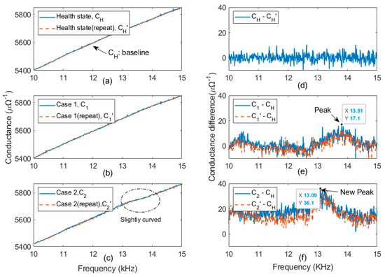 Damage quantification using the electromechanical impedance (EMI) method: (a) the conductance in the health case; (b) the conductance in damage case 1; (c) the conductance in damage case 2; (d) the difference between and ; (e) the difference in conductance between damage case 1 and the health case; (f) the difference in conductance between damage case 2 and the health case.