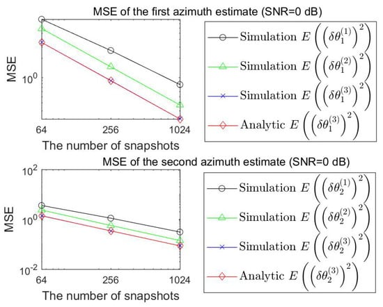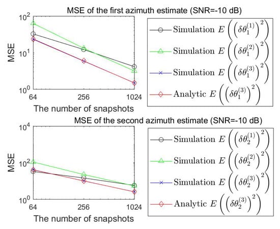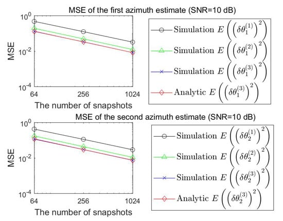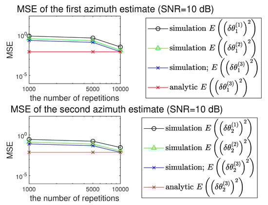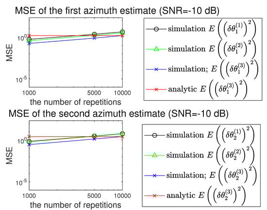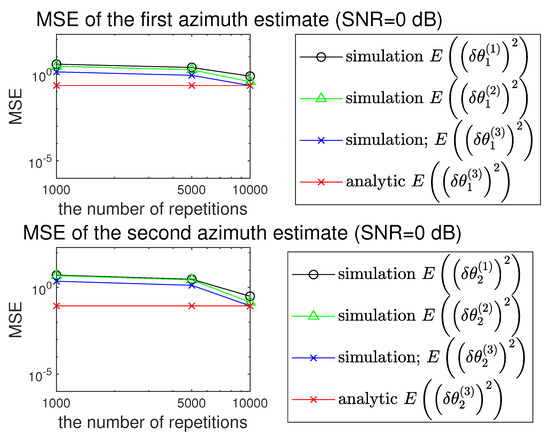 Figure 6, Figure 7 and Figure 8 illustrate how the MSEs are dependent on the number of repetitions for the fixed number of snapshots of 1024. It is clearly shown that the MSEs for all the estimates improve as the number of repetitions increases. It is shown in Figure 6, Figure 7 and Figure 8 that the agreements between analytic results and simulation results with superscript (3) are quite good for the number of repetitions of 10,000. Note that the number of repetitions in the Monte–Carlo simulation should be large enough for the simulation-based MSEs to be reliable.