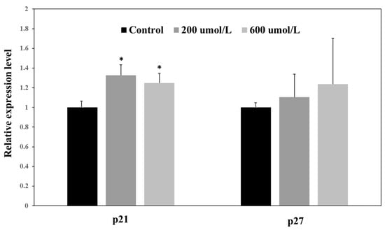 Relative expression levels of cyclin kinase inhibitor p21 and p27 in control, 200 and 600 μmol·L−1 treatment groups. * Significant difference between each treatment and control in each cyclin kinase inhibitor at p < 0.05.