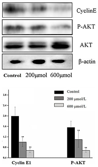 Images of Western blot analysis (top) and relative expression levels (bottom) of cyclin E1/β-actin and P–AKT/AKT in control, 200 and 600 μmol·L−1 treatment groups.
