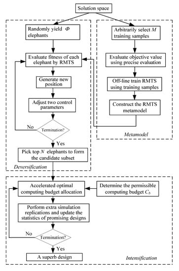 The solution method comprises of three parts, which are metamodel construction, diversification and intensification. The metamodel construction builds an RMTS metamodel to identify a set of likely solutions, the size of which can be a fraction of the size of the population. In the diversification part, the IEHO assisted by an off-line trained RMTS is utilized to search for N significant solutions within the large solution space. It has been shown in [12] that RMTS is competent in modeling complicated, nonlinear input–output relationships of discrete event simulated systems. In the intensification part, the AOCBA technique is used to identify the best solution among the N significant solutions found in diversification part. The AOCBA is aimed at obtaining an effective allocation rule such that the probability of correctly selecting the best alternative from a finite number of solutions can be maximized under a limited computing budget constraint.
