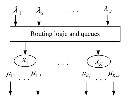 Figure 3 shows an example of a one-period multi-skill call center consisting of J call types and K agent groups. The indicates the arrival rate of the jth call types. The represents the number of agents in the kth angent groups. The mean service rate of the jth call types in the kth agent groups is , which depends jointly on the skill group and call type. At the beginning of the period, the call center is assumed to operate in a steady state relative to the staffing levels. The scheme to assign a newly-free agent for any queued call is that agent groups select call types according to increasing sequence of call-type number. The policy for assigning calls to agent groups is that calls select agent groups in order of increasing sequence of group number. Every agent group has its own prioritized list of call types. For the static routing, it is assumed that each call type has an ordered list of agent groups, used to select an available agent upon arrival. This ordered list is generally a strict subset of the agent groups, because not all agent groups can deal with a specific call type. If every agent group in this list is busy, then the call enters a queue with the same type calls. When an agent is available, this agent serves the longest-waiting call from the first non-empty queue in the ordered list.