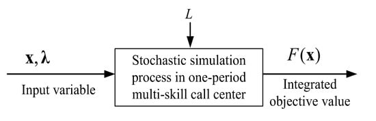 Figure 4 displays the input output relationship in a one-period multi-skill call center, where represents the solution vector, expresses the vector of arrival rates, represents the number of calls, and indicates the integrated objective value.
