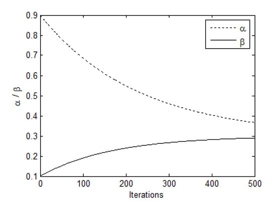 The integrated factor was 0.9 in the small problem. After running numerous hand-tuning experiments, the values of parameters used in IEHO were , , , , , , , and . Tentative experiments have shown that IEHO with the above values has performed better over 30 runs. The IEHO beneficially explored the solution space at the beginning and tended to exploit excellent solutions closer to the end. When the iterative processes proceeded, the parameters α and β were dynamically modified to emphasize diversity in early searches and intensity in later searches. Figure 5 presents the curves of α and β along with iterations. The value of α decreases exponentially. A large α is in favor of promoting diversity at the beginning, then a small α enhances fine-tuning of local search toward the end. The value of β is exponentially increased to keep a balance between explorative and exploitative processes. At first, β has a small value which can achieve the exploration goal more effectively. When the iterative process proceeds, β is exponentially increased and the search process progressively concentrates around the optimum to accomplish local exploitation. The number of significant solutions was N = 5. The following parameters were used in the AOCBA, = 20, = 10 and . The time saving factor corresponding to N = 5 is 2.08 [25]. Accordingly, the permissible computing budget is 24,038. Table 3 demonstrates the superb solution , cost, service-levels and the CPU times in the small problem.