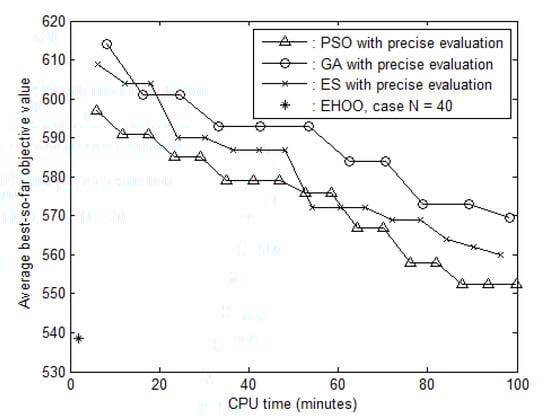 We simulated 30 individual runs for the large problem. Because three competing methods should execute a very long period of time to obtain the optimum, the search processes were stopped after they spent 100 min of consumed CPU time. Figure 6 displays the computing efficiencies and solution qualities using four approaches over 30 individual runs. The “” point with coordinates (1.93, 538.6) shown in Figure 6 represents the pair of consumed CPU time and average obtained objective value obtained using the EHOO for the case = 40. The progressions of the average best-so-far objective value of (28) and the corresponding consumed CPU times at the end of every iteration of three heuristic methods are also shown in Figure 6. The progressions of these values associated with PSO, GA and ES are plotted as solid line with triangles