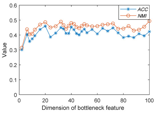 The effect of the dimensions of the bottleneck features produced by MAESC on the average channel on performance in terms of ACC and NMI.