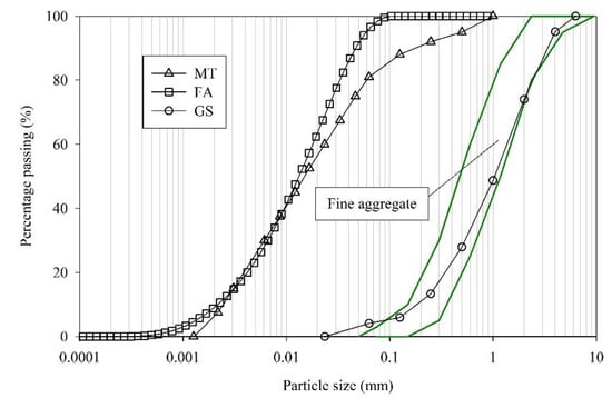 The particle size distribution (PSD) of the MT and GS, determined using sieves and sedimentation (for particles below 0.063 mm), is presented in Figure 2, which also includes the PSD of the FA, determined by laser granulometry. The fines contents (particles smaller than 63 microns) represented 91%, 98%, and 4% of the MT, FA, and GS compositions, respectively. The density of the MT (32.85 kN/m3) was significantly higher than those of the GS (25.81 kN/m3) and FA (21.75 kN/m3). The MT showed some plasticity, with a plastic limit of 10.4% and a liquid limit of 26.3%.