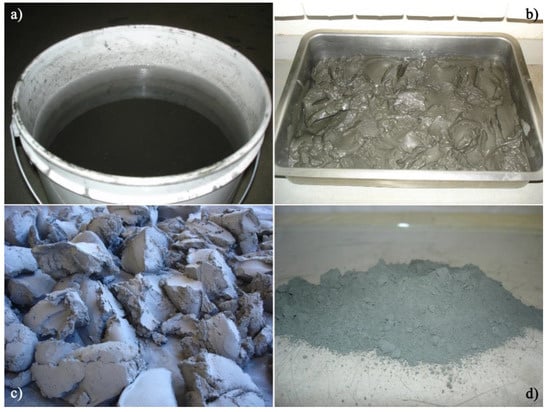 Tailings as received in the laboratory (a); after most of the water was removed (b); after drying in the oven (c); after breaking the clods (d).