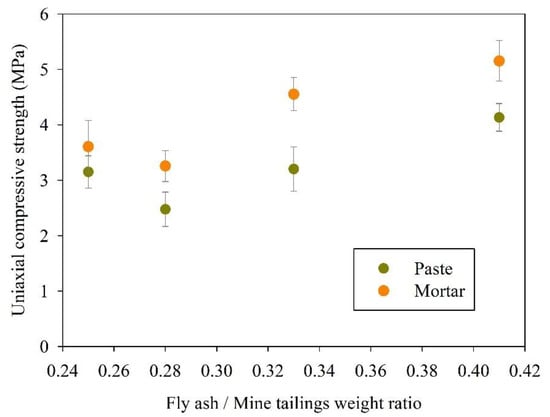 Regarding the ash/tailings ratio (with constant NaOH concentration and SS/SH ratio of 7.5 molal and 0.5, respectively), the results presented in Figure 4 show that an increase in the ash content produced an increase in compressive strength (UCS). The exception to this general trend was the paste with the lowest FA/MT ratio. This is not surprising, given that with a reduction in fly ash, the UCS tends to stabilise. Other authors [18], when studying the simultaneous activation of tungsten mining mud and red clay brick waste (precursor), using an activator solution based on SS and SH, obtained a compressive strength for the blends with a precursor content of 50% that was 3 times higher than that for the blends with only 10%. These authors were also able to prove that an increase in precursor content promoted the dissolution of some phases of the tungsten MT, with a positive effect on strength development. Given its higher strength among the P1 set, paste P1A was chosen for further analyses. The addition of the sandy aggregate to the paste produced a clearly positive influence on the mechanical response for every FA/MT ratio, representing a strength increase of between 14% (lowest FA/MT ratio of 0.25) and 42% (FA/MT = 0.33).