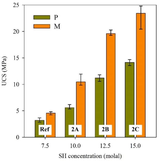 Regarding the influence of the NaOH concentration (Figure 5), it became apparent that this variable was responsible for the most significant impact on UCS. An increase in concentration was responsible for an increase in UCS by favouring alkalinity levels which facilitate the dissolution of the species needed to form the final structural matrix. Cihangir et al. [16], when investigating the effect of the activator composition on the strength of high-sulphide tailings, obtained UCS values very similar to those here presented (between 1 and 2 MPa after 28 days, and between 2.5 and 4.0 MPa after 1 year). These authors also tested the use of Portland cement, which resulted in a compressive strength of 1.5 MPa after one year of curing. Moukannaa et al. [17], also focusing on NaOH properties for the activation of phosphate MT and metakaolin blends, reached a similar conclusion, i.e., an increase in NaOH concentration produces denser and stronger pastes. Although paste P2C reached the highest UCS among the P2 set, paste P2B was chosen for further analyses since its strength/cost compromise was considered more effective, i.e., the strength showed by paste P2B is enough for situations where this material might be used (e.g., structural embankments, pavement bases and sub-bases), and its cost is approximately 90% that of P2C. The influence of the aggregate phase on UCS was also positive. However, it is noticeable that the strength increase due to the addition of sand was more significant than that registered when analysing the FA/MT ratio, varying between 42% (lowest concentration of 7.5 molal) and 75% (12.5 molal).