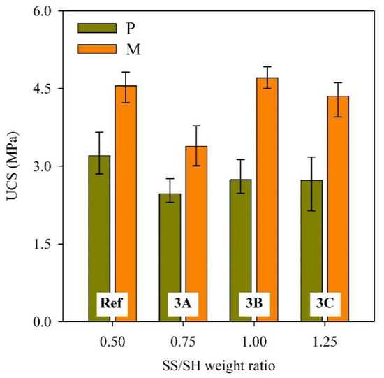 Of the three factors considered, the SS/SH weight ratio appears to be the factor producing the lowest level of influence on strength development (Figure 6). Even though this analysis is not straightforward, since there are other variables changing besides the SS/SH (i.e., the Ac/Sol and Na2O/SiO2 ratios and the water content), the results clearly show that a decrease in the SS/SH ratio did not produce a decrease in UCS. This also suggests that the sodium silicate content might be even further reduced without hindering the mechanical performance, which would represent a significant cost reduction or, possibly, a decrease in logistic complexity during live-scale applications if the SS is eliminated. Similar to the previous two analyses, the addition of the sandy skeleton showed a positive effect on UCS. Also similar is the fact that the trend of the UCS values obtained with the aggregate was very close to the trend obtained without it. In this case, the strength increase varied between 37% (SS/SH = 0.75) and 72% (SS/SH = 1.0).