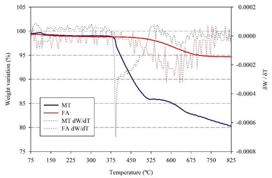 Figure 7 shows the results of the thermogravimetric analysis (TGA) and respective derivative (DTG) of the tailings in the range 75 °C to 825 °C. The analysis of the fly ash is also included for comparison purposes. According to the literature [46], approximately 0.5% of the total weight loss usually registered during thermogravimetry of coal fly ash occurs below 500 °C, with an additional 2% after that, corresponding to the release of volatile matter from the sample and assuming that the TGA is carried in an oxidizing atmosphere (e.g., air) [47]. This behaviour is consistent with the result obtained for this particular FA. The MT started a significant weight decrease at the 375 °C mark, of more than 10%, resulting from the transformation of the pyrite’s sulphur into gas [48]. When the temperature reached 585 °C, another stepped loss was noticeable, related with further decomposition of the pyrite [49].