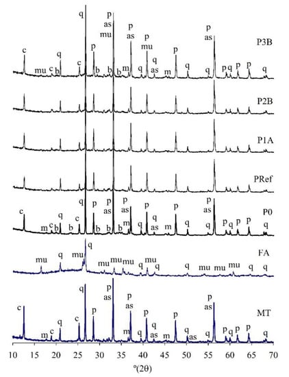 The pastes showed peaks associated with the crystalline phases of the FA (quartz and mullite) and MT (arsenopyrite, chamosite, muscovite, quartz, and pyrite), only with a lower intensity due to a dilution effect. This indicates that such phases are mostly inert. Some of the peaks associated with the chamosite phase (Fe2+; Mg; Fe3+)5Al(Si3Al)O10(OH;O)8 on the MT showed lower intensities after activation (paste P0), suggesting that these phases partially participated in the reactions. This intensity reduction appears to have also occurred on the remaining four pastes analysed; however, in this case, the original MT peaks are diluted with the FA peaks.
