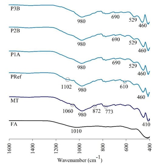 The FTIR spectra of the same pastes are presented in Figure 9. The FA presents two main bands, at 1010 cm−1 (Si-O-T stretching vibrations, with T = Si or Al) and 410 cm−1 (O-Si-O). The MT shows a classic and very intense Si-O-T band at around 980 cm−1, corresponding to asymmetric stretching modes of the SiO4 and AlO4 tetrahedra; this band was maintained in the pastes. The bands at 872 cm−1 and 773 cm−1 (also on the FA), typical of Si-O-T (T = Si or Al) stretching vibrations, and the band at 690 cm−1 (also in the FA), typical of Al-O, appear on the original MT and in the all the resulting pastes, which reflects the partial crystalline nature of the MT.