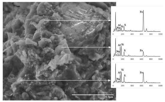 SEM and EDX of P0, PRef, P1A, P2B, and P3B are presented in Figure 10 and Figure 11, respectively. The presence of Fe in the P0 is, as expected, very intense. The gel phase, characterised in Figure 10, essentially constituted Na, Al, Si, and S. Based on these semi-quantitative values, it is possible to conclude that a N-A-S-H-type gel was developed, responsible for the strength gain. However, at this stage, the possible inclusion of sulphur ions in the gel structure was also considered, even if the exact role of such ions was not yet established.