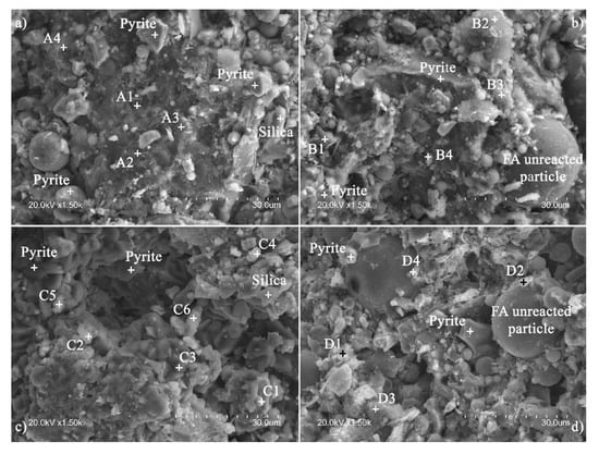 In terms of morphology, the micrographs indicate fairly compacted material due to the formation of gel with a SiO2/Al2O3 molar ratio of approximately 2 (Table 5). Nevertheless, several intact pyrite and ash particles are still visible. The P2B paste presented an apparent lower amount of unreacted FA particles (Figure 11c) and a higher volume of gel compared with the remaining three pastes. This higher reaction degree, responsible for the highest UCS reached by this paste (Figure 5), is a consequence of the higher concentration of the activating solution (12.5 M, Table 2).