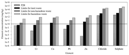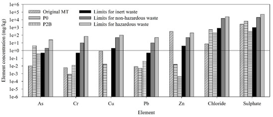 The leachable concentrations obtained during test LTT1 were compared with the threshold values presented in Council Decision 2003/33/EC for inert waste, non-hazardous waste, and hazardous waste (Figure 12). In general, activation of the original MT (paste P0) produced a decrease in the leached concentration, the exceptions being As, which showed a significant increase after the AA reactions, and chlorides and sulphates. The eluate collected from paste P2B improved upon the performance showed by the P0 paste, although elements Cr and Pb presented slightly higher solubility, above even the values presented by the original MT. Nevertheless, the addition of FA resulted in increased performance and complied with the most severe limits imposed by the European standard (inert waste disposal).