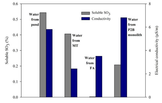 The leaching LTT2 test results were compared with the soluble SO3 values measured directly from the water collected in the pond and from a sample of MT that was submerged in water for 28 days upon arrival to the laboratory (Figure 14). The value obtained after 28 days is comprehensively lower that the value obtained from the pond, while the value obtained in the LTT2 test is even lower (approximately 45%) than the 28-day solubility, confirming the effectiveness of the stabilisation in terms of environmental performance. The figure also presents the conductivity measured in the same samples. In this case, the value measured in the water from the LTT2 test was significantly increased relative even to the pond water. This is most likely explained by the addition of fly ash, which generated a conductivity value in the submersion water higher than that in the water from the MT.