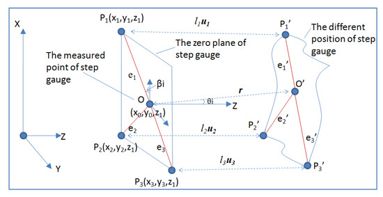 In order to eliminate the Abbe measurement error, we designed a mathematical model of SMLI which can synthesize the three laser light paths into the one measured center line of the step gauge, as shown in Figure 1. The and are the installation points of three reflector mirrors, and the O is the measurement point of the step gauge. The three reflector mirrors and the step gauge are installed in the same moveable platform. The is the first laser measurement path during the measurement that is marked as ( is the measurement value of the first interferometer, and is its unit directional vector), the is the second laser measurement path that is marked as ( is the measurement value of the second interferometer, and is its unit directional vector), the is the third laser measurement path that is marked as ( is the measurement value of the third interferometer, and is its unit directional vector), and the (the O point is the first measurement position and the O’ is the nth measurement position) is the synthesized measurement path of the measured step gauge that is marked as (r is the only unknown quantity). The is the angle between the direction of OPi and X axis of coordinate system, which is known and definite. The is the angle between the direction of PiPi’ (i = 1,2,3)and the Z axis of the coordinate system, which represents the change of pitch angle and yaw angle during the measurement and is measured by the auto-collimator.