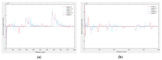Simulation distribution of measurement length deviation of different distances of step gauge with different attitude angle θ; (a). θ is a negative angle, which means the normal direction of the measured surface and the starting zero plane of the step gauge is opposite; (b) when θ is a positive angle, the normal direction of the measured surface and the starting zero plane of the step gauge are the same.