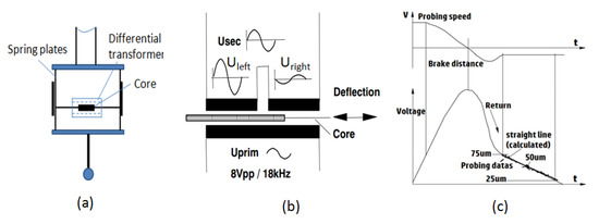 Measuring principle diagram of precision displacement probe for Coordinate Measuring Machine (CMM). (a) Mechanical schematic diagram of the CMM probe; (b) circuit schematic diagram of the CMM probe; (c) schematic diagram of the voltage of the probe signal changing with time during the contact measurement of the probe.