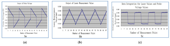 The key technology of the step gauge measurement system in realizing the high measurement accuracy is to realize the synchronous sampling and signal synthesis of the probe voltage signal of the CMM and the displacement measurement data of the laser interferometer. The probe of CMM produces the voltage signal with linear change in the measurement process, as shown in Figure 5a. Through synchronous dynamic sampling, the corresponding laser interferometer displacement measurement signal is obtained, as shown in Figure 5b. After the two signals are synthesized, the constant coordinates of the measuring points at the time of triggering are obtained, as shown in Figure 5c.