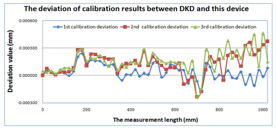 In order to verify the correctness of the mathematic model and this device, a step gauge made by the KOBA company of Germany is calibrated. The maximum deviation of measurement results between this device and the Deutscher Kalibrierdienst (DKD) device is less than 0.5 μm, as shown in Figure 6.