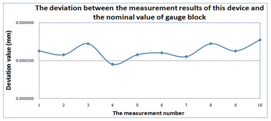 In order to verify the measurement accuracy of this device, a second-grade standard gauge block of 500 mm was repeatedly calibrated 10 times. The deviation between the measurement results of this device and the nominal value of the gauge block is shown in Figure 7.
