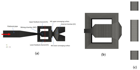 In 2018, the same configuration previously employed by [1], although now using a single exit, was numerically evaluated in 3D at Reynolds 30000 using the SST turbulent model by Pandley and Kim [9]. Two geometry parameters, the mixing chamber inlet and outlet widths were modified. They observed a significant effect of the flow structure and the feedback channel flow rate when modifying the inlet width, negligible effects were observed when modifying the outlet width. The output frequency and amplitude effects whenever the (FC) and the mixing chamber (MC) lengths were modified, was studied using a 2D numerical model by Seo et al. [10], the fluid was considered as incompressible, the Reynolds number employed was 5000. They observed that an increase of the feedback channel length generated no modifications on the output frequency, the same observation was previously obtained by [11], in both cases the flow was defined as incompressible, being the reason why the simulations could not provide the correct information. On the other hand, the increase of the mixing chamber length, generated a clear reduction on the actuator output frequency. They defined the length scale to be employed to properly non-dimensionalize the oscillation frequency.