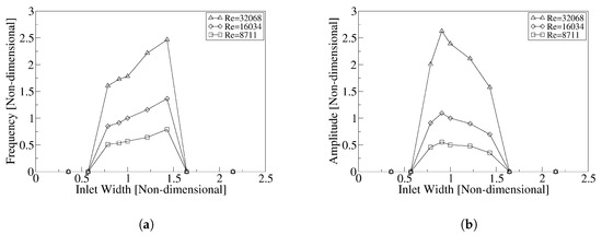 Fluidic oscillator output mass flow frequency (a) and peak to peak amplitude (b) as a function of the mixing chamber inlet width and for three different Reynolds numbers, 8711, 16034 and 32068.