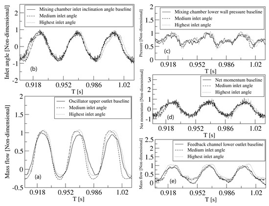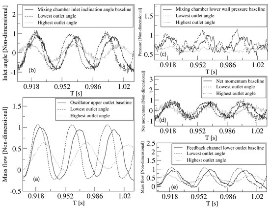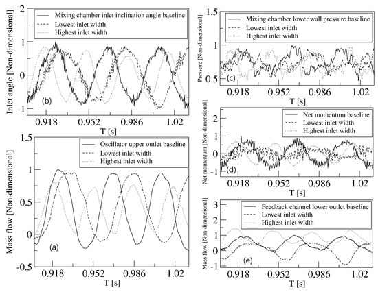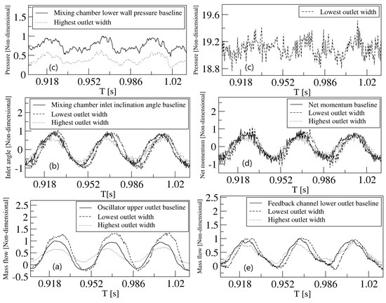 The evaluation of the dynamic values of the, net-momentum acting onto the jet entering the mixing chamber, the pressure at the (MC) outlet converging walls, the (MC) inlet inclination angle, the (FC’s) mass flow and the (FO) output flow, greatly helps in understanding the (FO) dynamic performance. Figure 5 introduces the non-dimensional dynamic values of the mass flow through one of the (FO) outlets, the lower (FC) mass flow, the stagnation pressure at the (MC) outlet lower convergent wall, the net-momentum acting on the (MC) incoming jet and the (MC) inlet jet inclination angle. The Reynolds number was kept constant at 16,034. In each graph it is presented the non-dimensional dynamic value obtained for the baseline case, original actuator, and the corresponding ones characterizing the maximum and minimum inlet widths evaluated at which pulsating flow was observed. The first thing to notice is, that the dynamic stagnation pressure appearing alternatively at the (MC) converging walls, Figure 5c, is driving the oscillation, the rest of the graphs presented simply follow these pressure pulsations. From the oscillator upper outlet mass flow graph, Figure 5a, it is observed that the mass flow amplitude is directly linked with the reverse flow appearing at the (FO) outlets, the higher the reverse flow the higher the mass flow outlet amplitude, large reverse flows are associated to small inlet widths. This direct relationship is obvious when considering that the incoming (FO) mass flow is constant and given by the inlet boundary conditions, and at each instant, the mass flow through the two (FO) outlets must be the same as the inlet mass flow, the fluid is considered as incompressible. Therefore, if at some particular time, reverse flow appears at one of the (FO) outlets, the (FO) mass flow amplitude must increase to fulfill the continuity equation at each time instant.