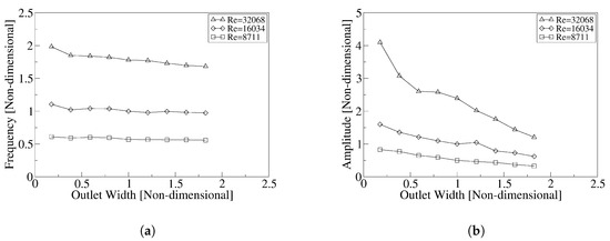 Fluidic oscillator output mass flow frequency (a) and peak to peak amplitude (b) as a function of the mixing chamber outlet width and for three different Reynolds numbers, 8711, 16034 and 32068.