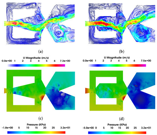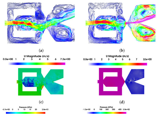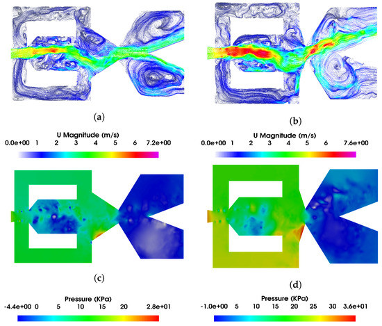 Fluidic oscillator internal velocity field (a,b), and pressure magnitude (c,d). Maximum inlet width (a,c), minimum inlet width (b,d). Reynolds number 16034.